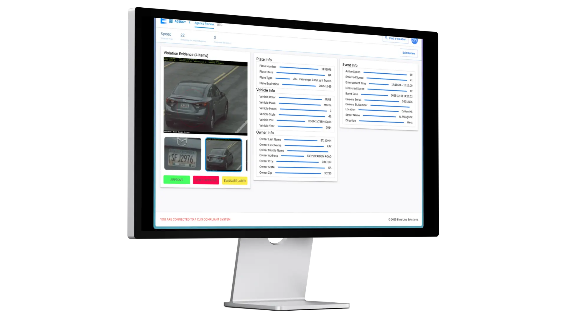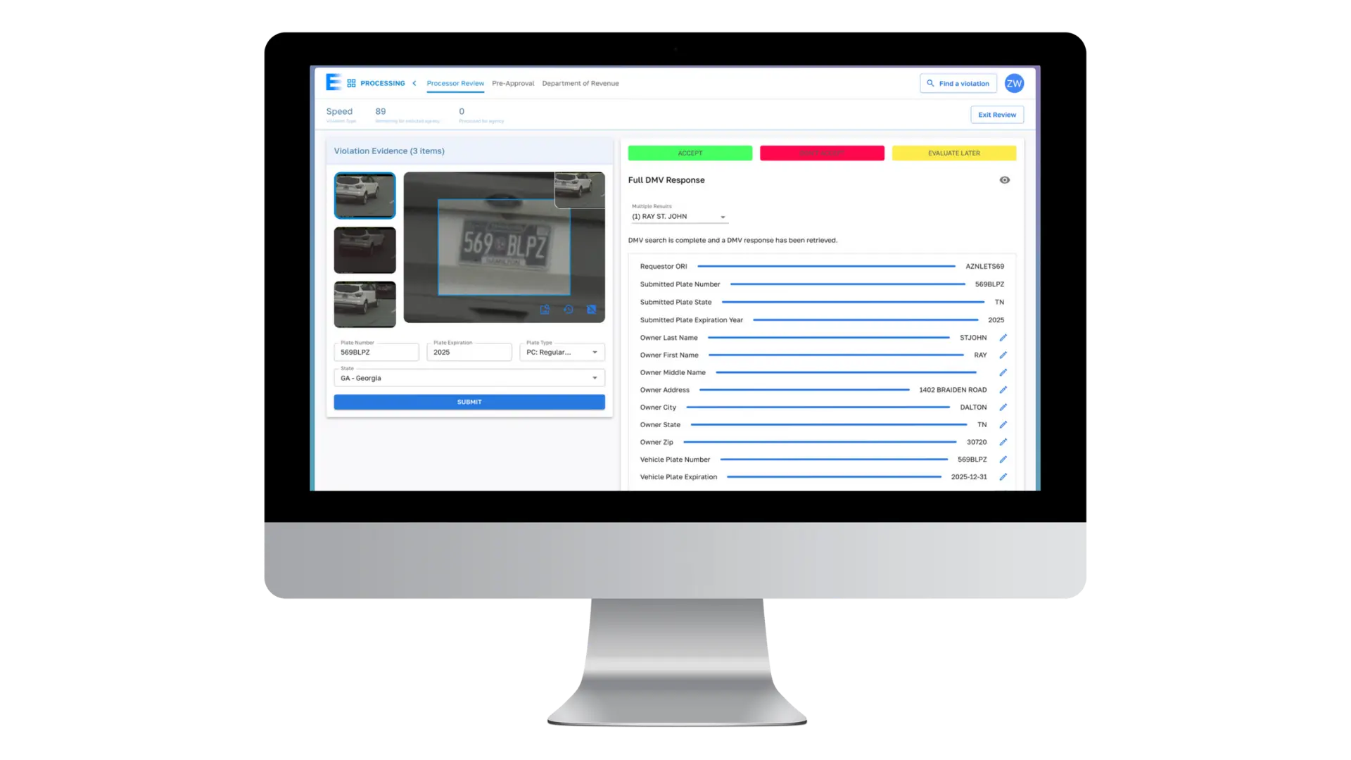 For each potential violation, there is an evidence screen with photo, video, license plate information and more to help evaluate and process any violations.